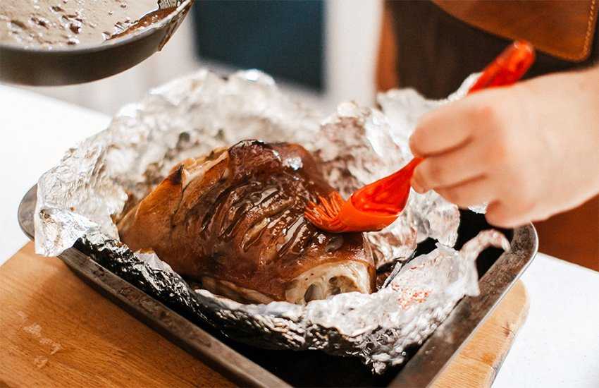 - В фольге или рукаве. Чтобы мякоть говядины получилась более сочной, рекомендуется доложить к ней кусочек сливочного масла. Если хотите, чтобы на мясе образовалась хрустящая зажарившаяся корочка, за 15 минут до полной готовности откройте рукав или фольгу, или разрежьте.