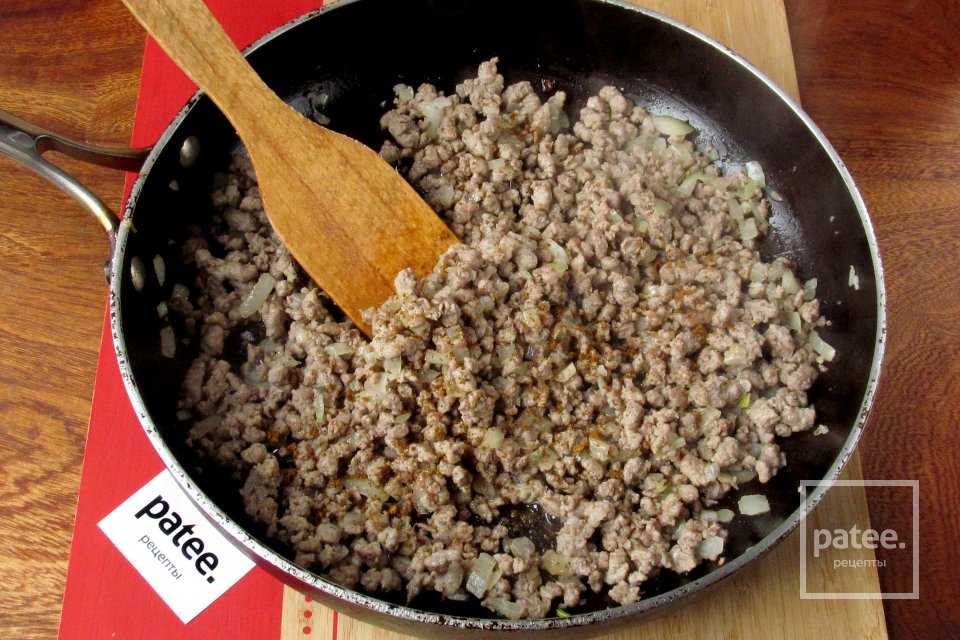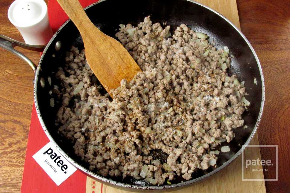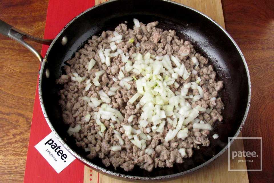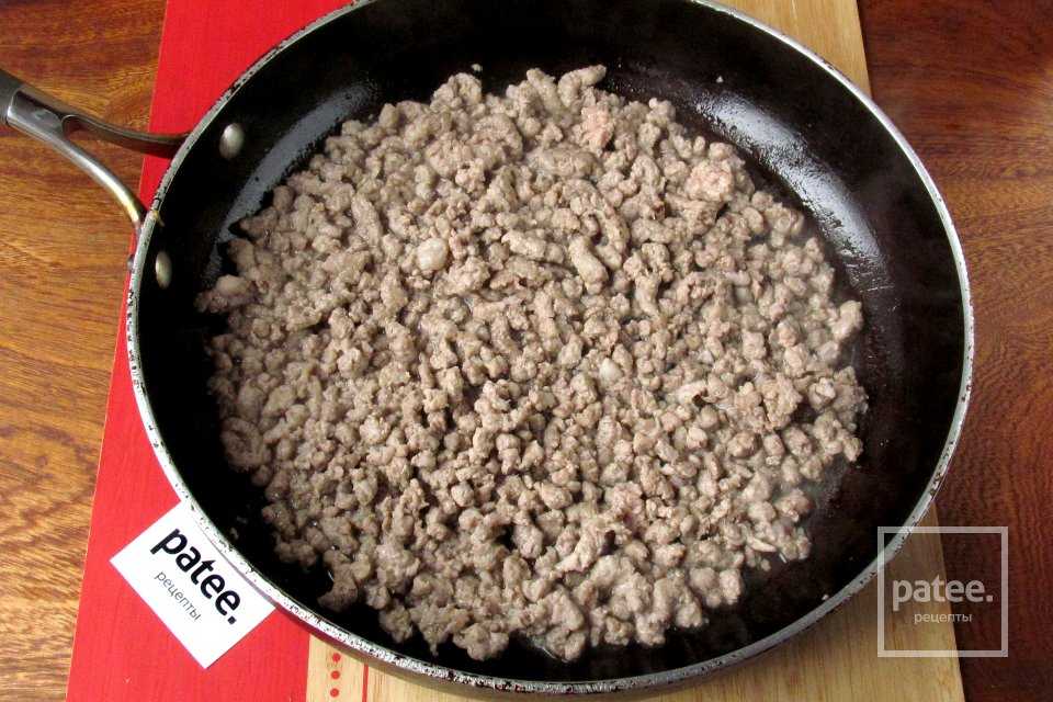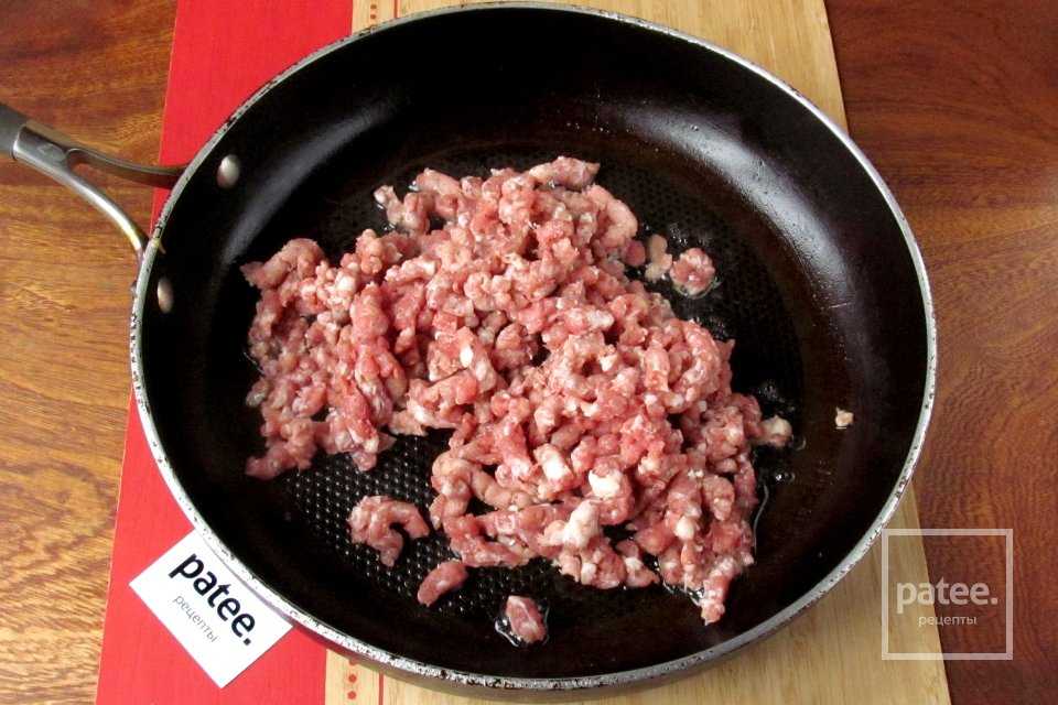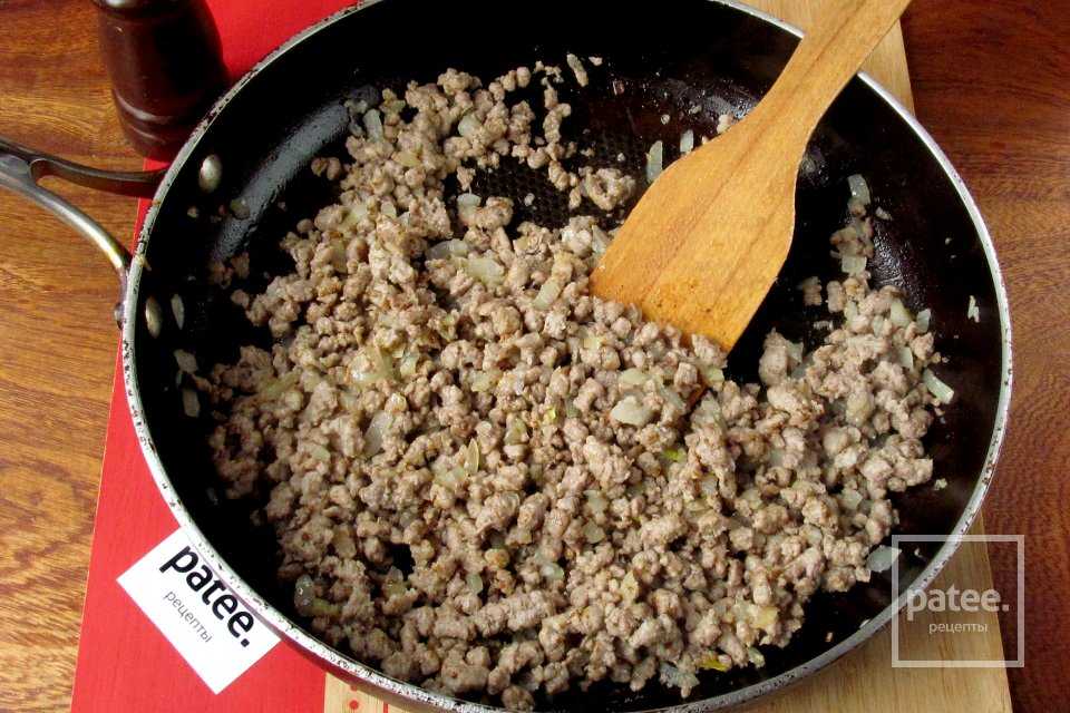 - Добавьте фарш. Пусть он жарится 15 минут, при этом иногда мешайте.