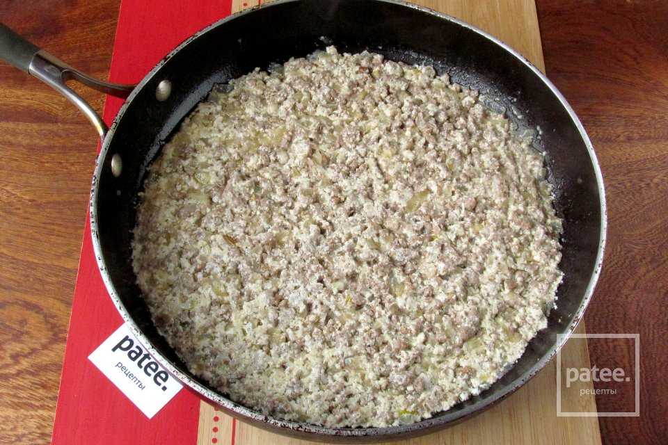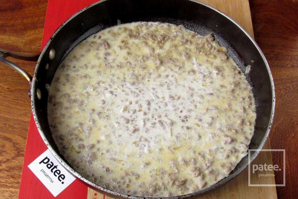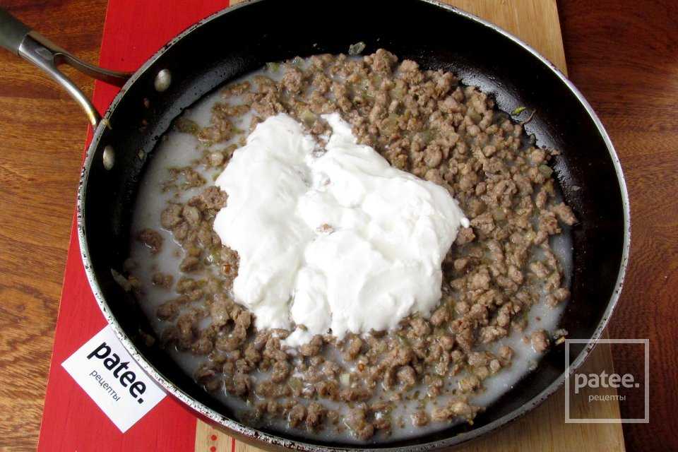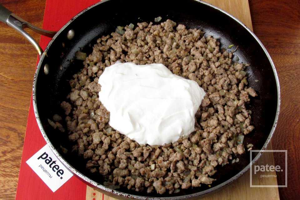 Перемешиваем фарш в сковороде, добавляем сметану.