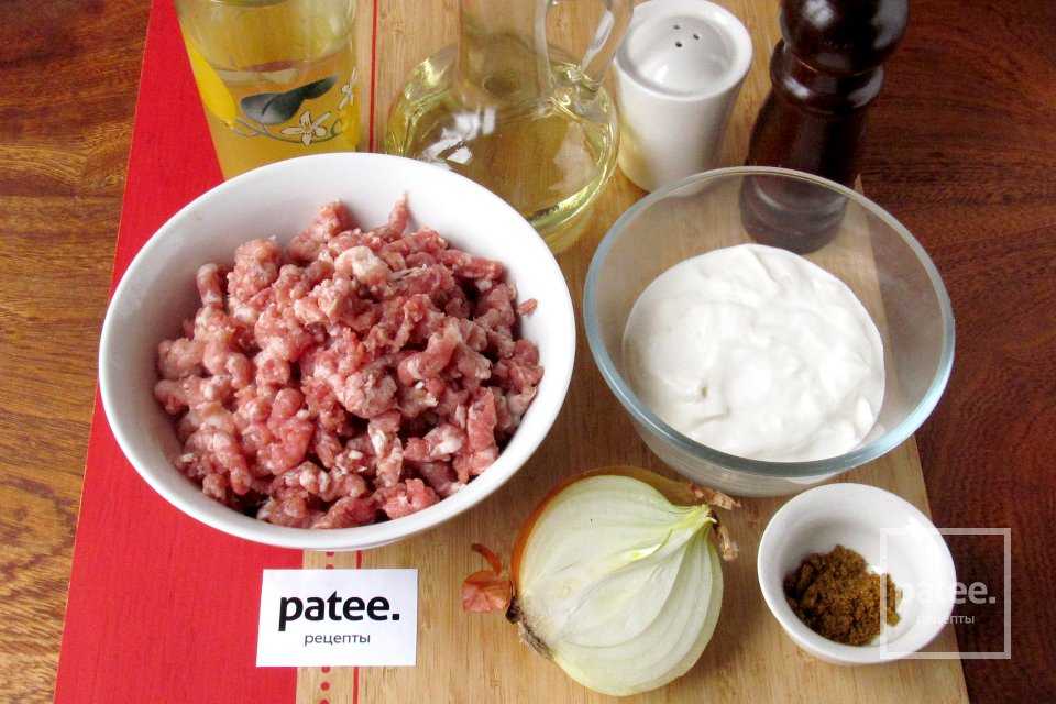 Для приготовления фарша в сметанном соусе нам понадобятся следующие ингредиенты: свиной фарш, сметана 15-20% жирности, вода, репчатый лук, масло подсолнечное рафинированное, хмели-сунели, соль, чёрный молотый перец.