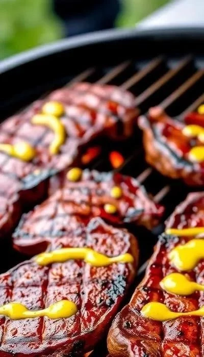 Встречайте лето 2025 с этим восхитительным рецептом! Для приготовления сочной говядины на гриле нам потребуется: 800 г говяжьей вырезки или стейков, 3 ст.л. дижонской горчицы, 2 ст.л. русской горчицы, 1 ст.л. тертого хрена, 2 ст.л. оливкового масла, 1 ст.л. соевого соуса, 1 ч.л. паприки, соль, черный перец по вкусу.
