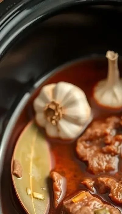Ингредиенты: 1 кг говядины (лопатка или грудинка), 3-4 зубчика чеснока, 2-3 лавровых листа, 1 луковица, 1 морковь, 2 ст. ложки растительного масла, соль, перец по вкусу, 500 мл воды или бульона.