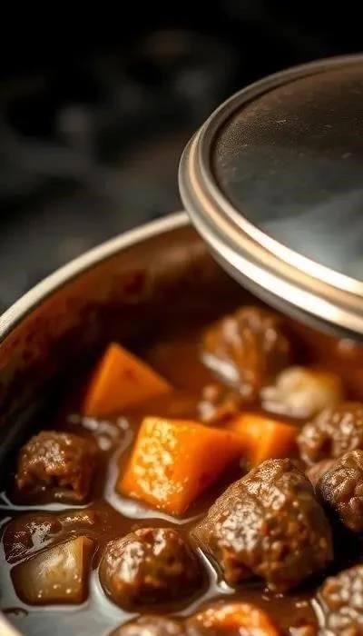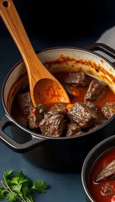 Шаг 5: Проверка готовности. Проверьте готовность мяса вилкой. Если мясо легко протыкается, значит, оно готово. Если необходимо, добавьте еще немного воды и тушите еще 15-20 минут. Как отмечалось 6 февраля 2021 года, это очень простое блюдо, но требующее времени для тушения. Не торопитесь, и результат вас порадует! Помните, что говядина должна быть нежной и сочной.