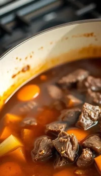На плите: Обжарьте говядину, нарезанную кубиками, до золотистой корочки. Добавьте лук, морковь и сельдерей, нарезанные соломкой, и обжаривайте еще 5-7 минут. Залейте водой или бульоном, добавьте специи и тушите на медленном огне 1,5-2 часа, пока мясо не станет мягким. Бефстроганов готовится похожим образом, но мясо нарезается тоньше.