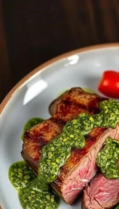 Для эффектной подачи используйте свежие травы – веточки розмарина или тимьяна добавят аромата и визуальной привлекательности. Соус песто можно аккуратно полить поверх мяса, создав красивый узор. Посыпьте блюдо свежемолотым черным перцем и хлопьями красного перца для пикантности.