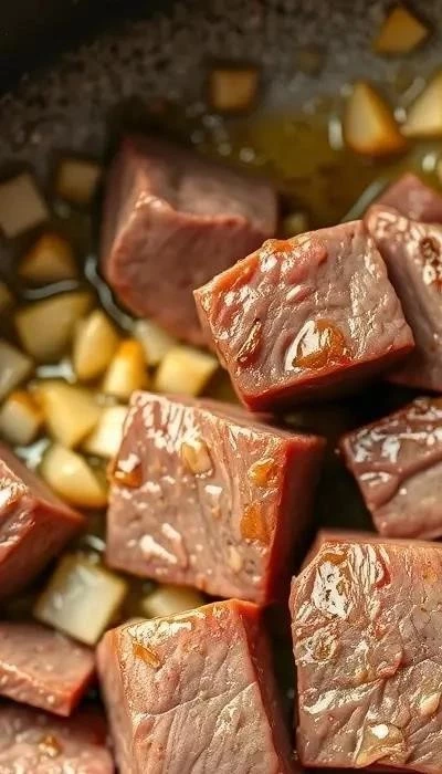 Замаринуйте говядину в смеси оливкового масла, чеснока, соли и перца на 30 минут. Затем обжарьте мясо на сильном огне до золотистой корочки. Важно не пережарить говядину, чтобы она осталась сочной. Обжаривание мяса небольшими порциями позволит добиться равномерной прожарки.