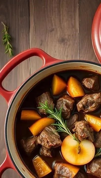 Ингредиенты: 500 г говядины (лопатка или шея), 2 крупных яблока (Антоновка или Симиренко), 1 луковица, 2 ст.л. растительного масла, 100 мл яблочного сока, 1 ст.л. муки, соль, перец – по вкусу, корица – щепотка.