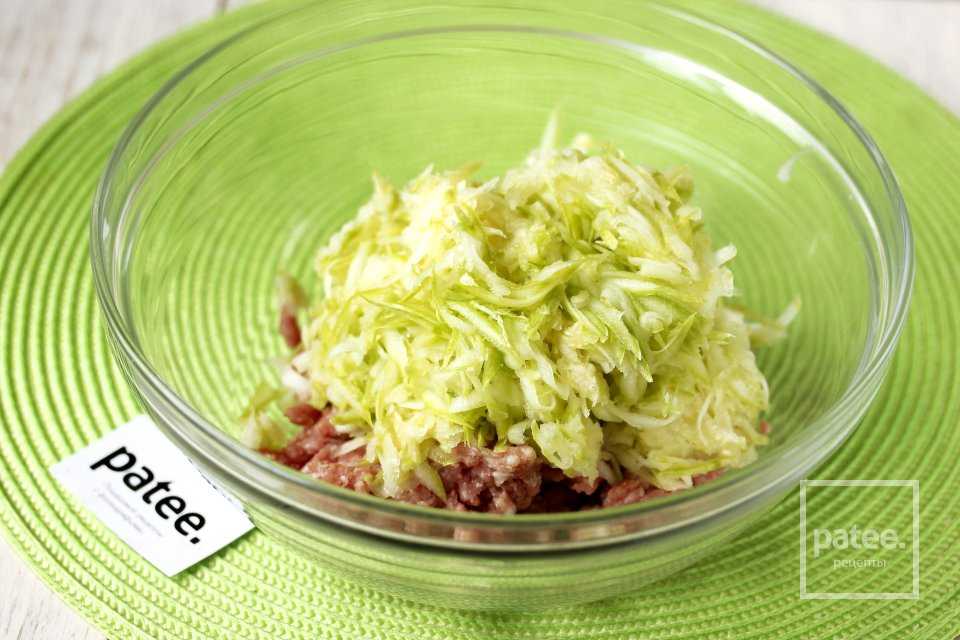 Кабачок тщательно моем, обрезаем края и натираем на крупной тёрке, слегка отжимаем сок. Перекладываем тёртый кабачок в миску с фаршем.