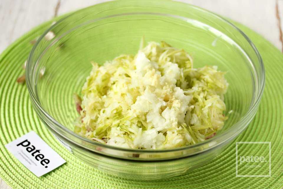 1. Кабачки натираем на крупную терку и откидываем на дуршлаг, чтобы стек лишний сок.