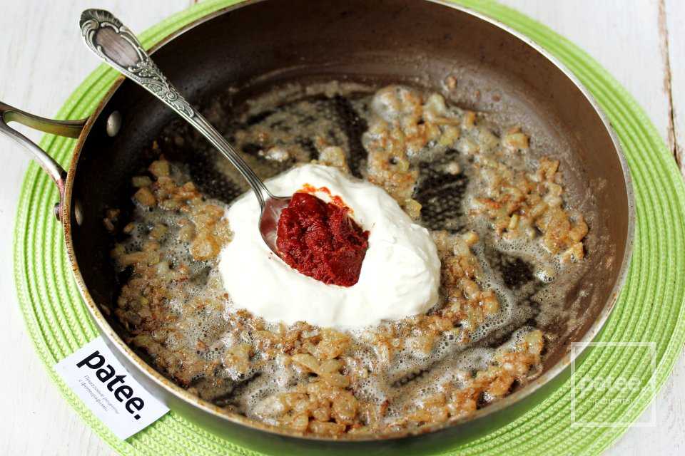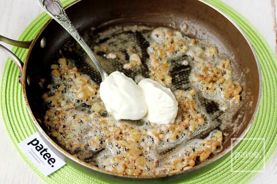 Затем в сковороду добавляем сметану, три полные столовые ложки.