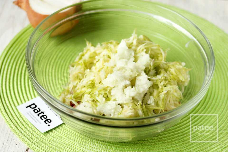 Репчатый лук чистим, пропускаем через мясорубку, добавляем получившуюся луковую кашицу в миску с фаршем и кабачковой массой.