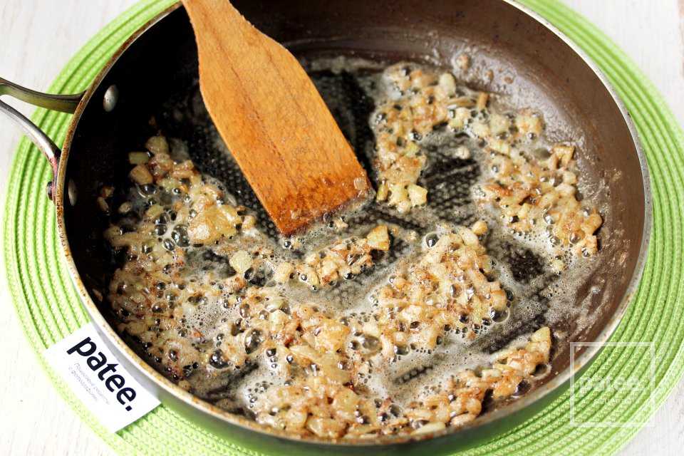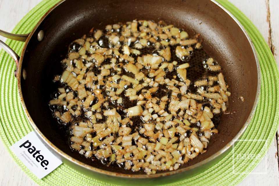 В эту же сковороду выкладываем нарезанный маленькими кубиками репчатый лук и обжариваем его до золотистости.