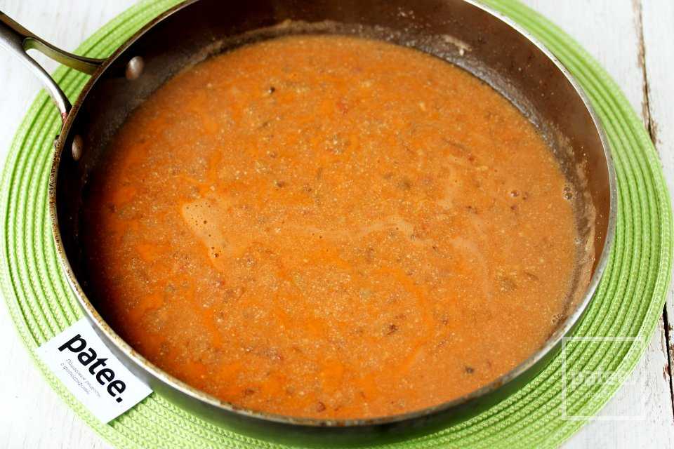 Вливаем в сковороду кипящую воду и перемешиваем до получения однородного соуса, солим по вкусу. Доводим сметанно-томатный соус до кипения.