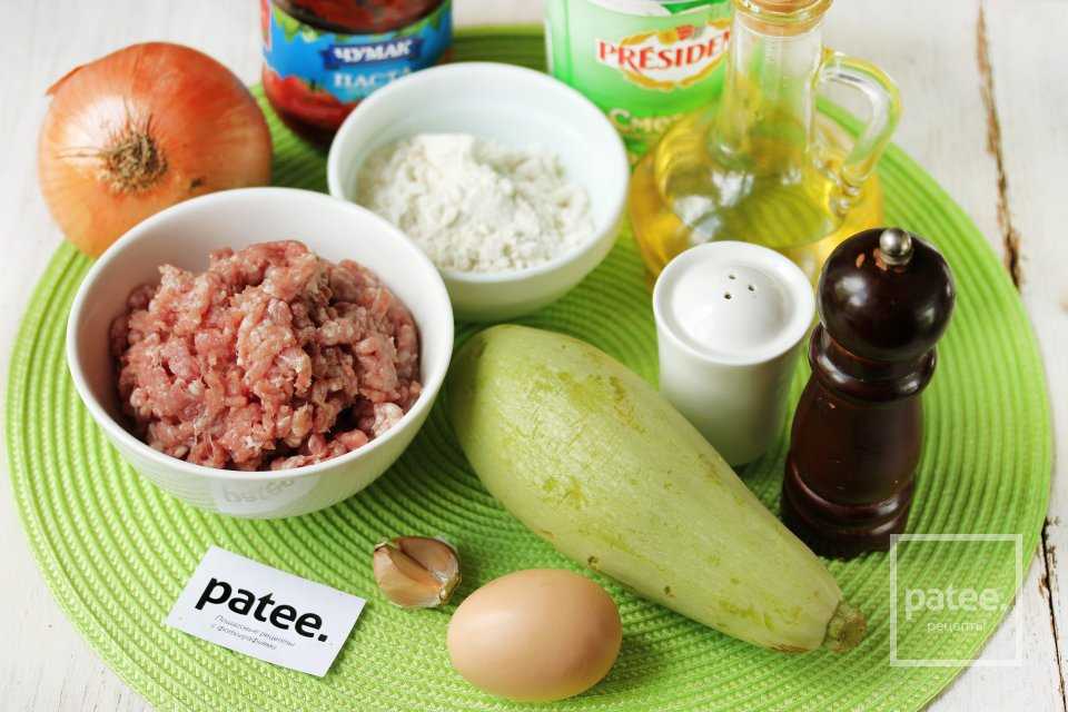 Для приготовления котлет с кабачком в соусе нам понадобятся следующие ингредиенты: свиной фарш, свежий кабачок, куриное яйцо, репчатый лук, чеснок, масло подсолнечное рафинированное, пшеничная мука, томатная паста, сметана, соль, чёрный молотый перец.