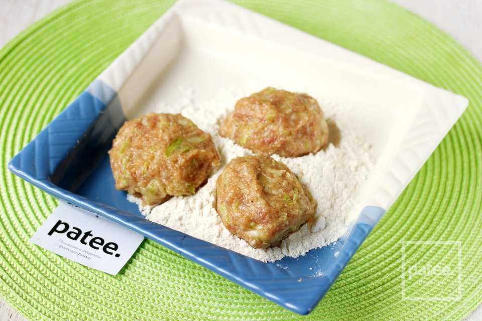 Смоченными в воде руками формируем из свино-кабачкового фарша небольшие круглые котлетки и панируем их со всех сторон в муке.