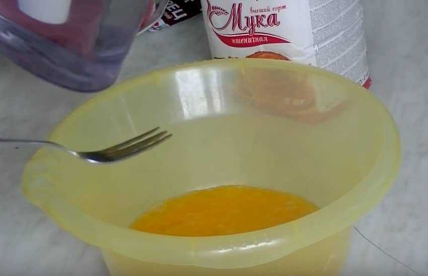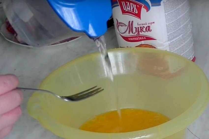 1. В миску я вливаю кипяченную остывшую воду, вбиваю одно куриное яйцо, кладу соль. Перемешиваю венчиком.