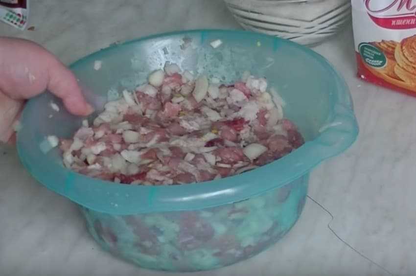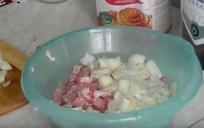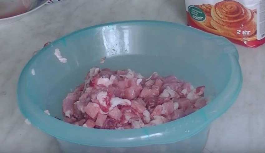 6. Приступайте к начинке: свинину нарубите мелким кубиком. В принципе, чем мельче покрошите, тем однороднее и нежнее будет начинка.