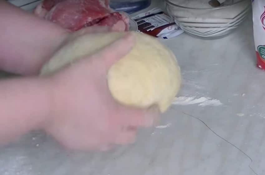 От теста отщепляем кусок размером чуть больше мячика для тенниса. Слегка подпыливаем мукой сухой и чистый стол.