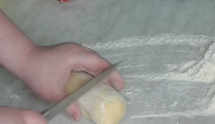 10. Не очень острым ножом нарежьте «колбаску» на небольшие кусочки, которые раскатайте на кружки средней толщины.