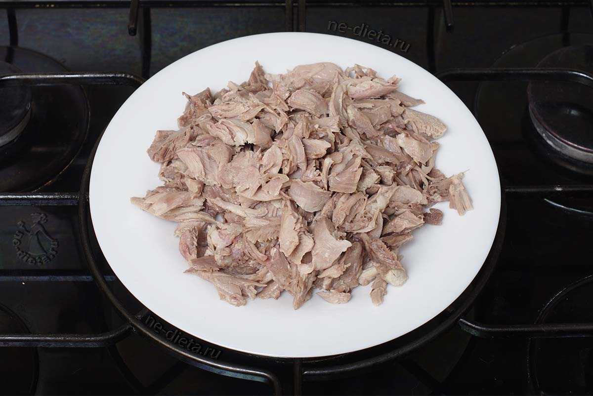 Индейку вынуть из готового бульона и слегка остудить, затем отделить мясо от костей и порезать его на небольшие кусочки. При этом следует помнить, что внутри голени помимо костей встречаются твердые сухожилия, похожие на тонкие белые косточки, которые также необходимо удалить.