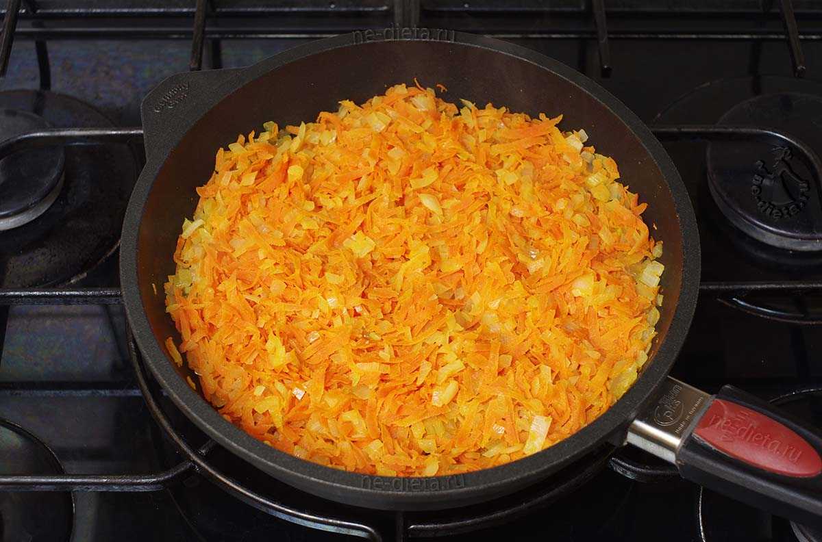 В сковороде разогреть растительное масло, положить лук и морковь и обжарить их на среднем огне в течение 5 – 7 минут до прозрачности.