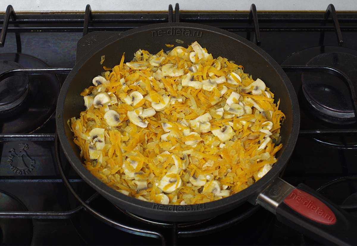 Положить зажарку из овощей и грибов, а также консервированную красную фасоль, с которой нужно предварительно слить сок.