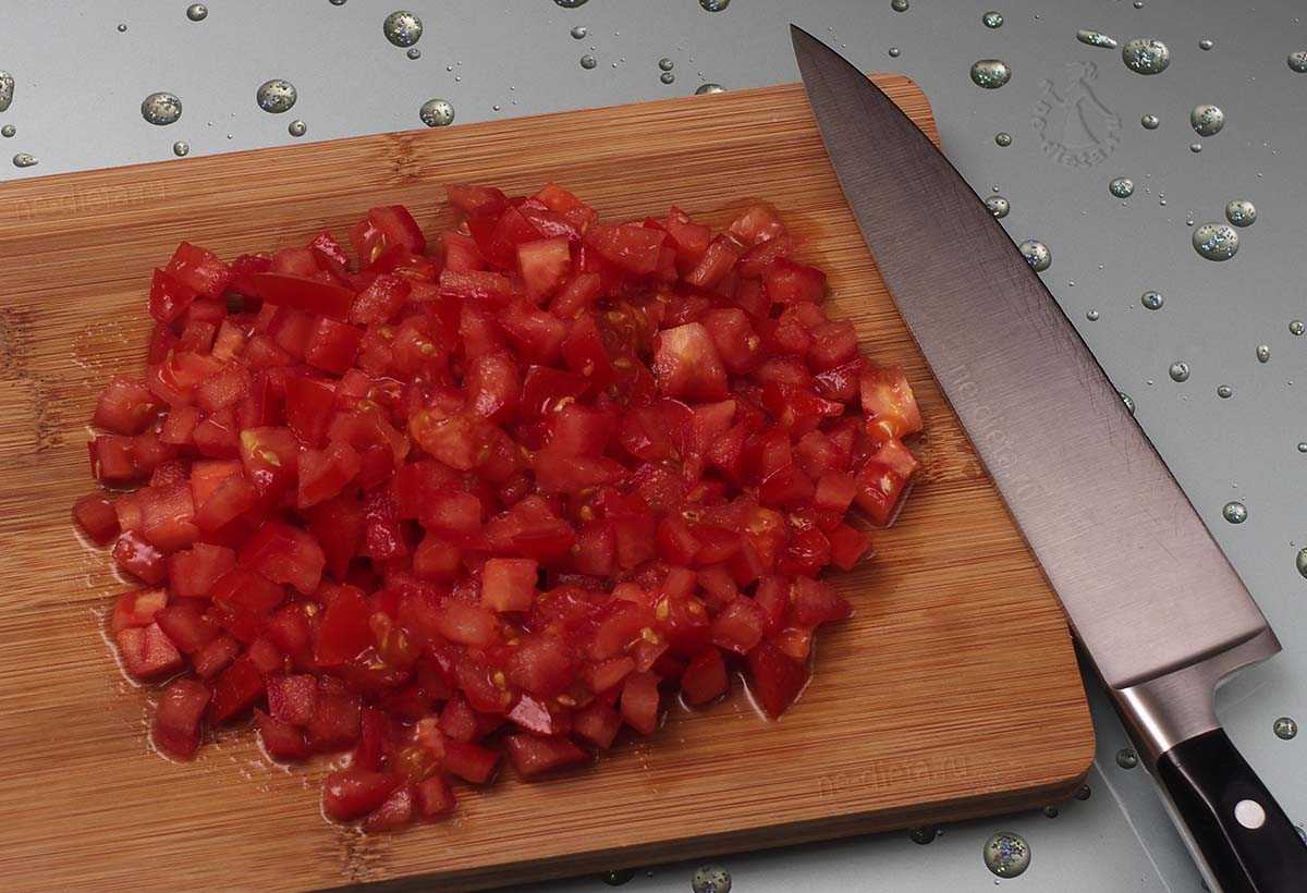 Свежие помидоры порезать небольшими кубиками, не очищая от кожуры.