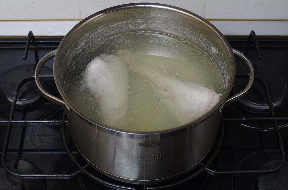 Для того чтобы приготовить щи с индейкой, свежей капустой и грибами, первым делом необходимо сварить насыщенный мясной бульон. Для этого индейку надо промыть, залить холодной водой и поставить на большой огонь. Когда вода закипит, огонь нужно убавить, полностью снять образовавшуюся пену и варить бульон при небольшом кипении в течение 1.5 часов.