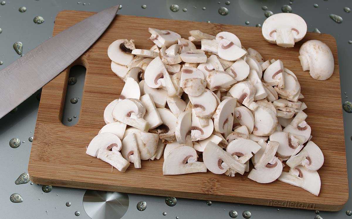 Шампиньоны тщательно вымыть и поскрести ножиком, если это необходимо, после чего порезать тонкими пластинками.