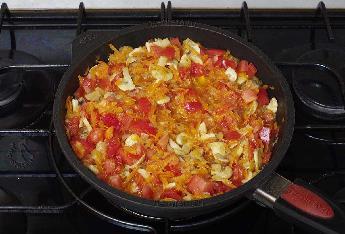 Положить томаты и готовить еще 5 минут, периодически помешивая.