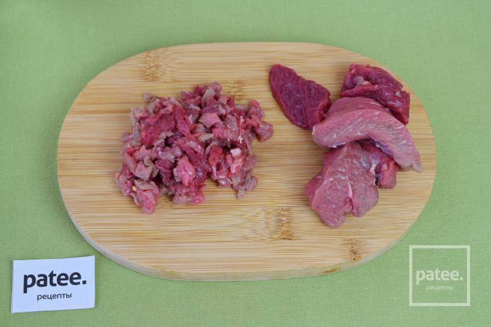 Порежьте мясо кубиками со стороной 4 мм. Нарезку проводите поперек волокон мяса.