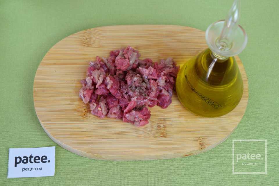 - Поперчить и посолить мясные кубики по вкусовым предпочтениям и качественно перемешать.