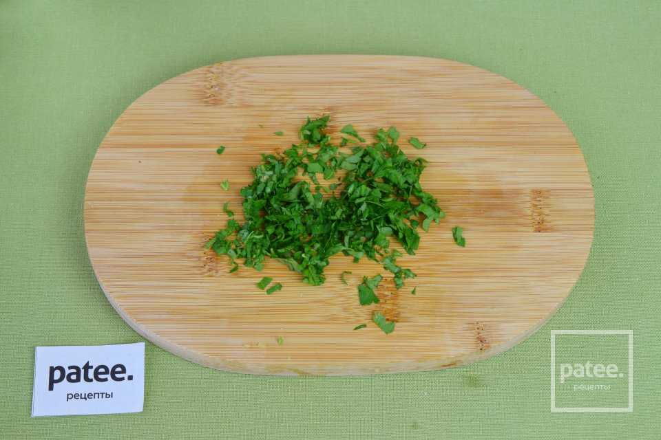Петрушку промываем под проточной водой, отряхиваем от лишней жидкости и выкладываем на разделочную доску. Воспользовавшись ножом, очень мелко рубим зелень и после – перекладываем ее в свободную тарелку.