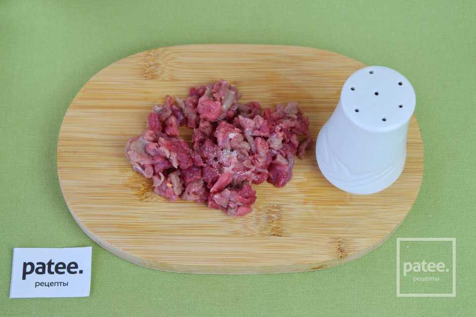 - Далее мясные полоски требуется нарезать на кубики (высота грани также не более 5 мм).