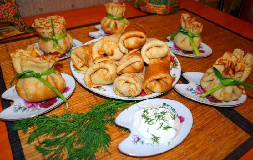 Сверху их можно посыпать зеленью или тертым сыром, можно полить сметаной или горчицей. А в качестве дополнения к этому блюду из блинчиков могут послужить простые овощные салаты или самые разнообразные соления.
