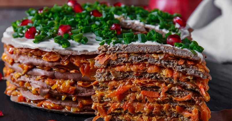 Печем блины с добавлением говяжьей печени и укладываем их в мягкий вкусный торт, прослаивая начинкой из моркови, лука, соуса и приправ. Этот торт уже настоящая насыщенная еда. И он настолько вкусный, что с каждым съеденным кусочком хочется еще и еще.