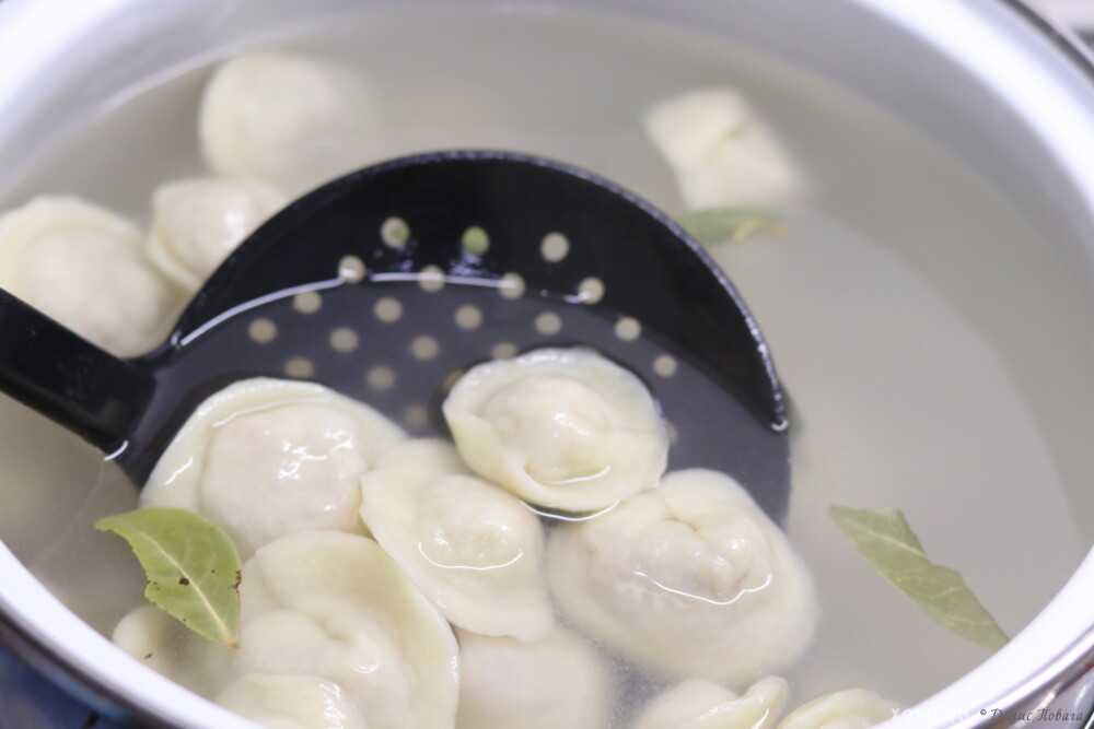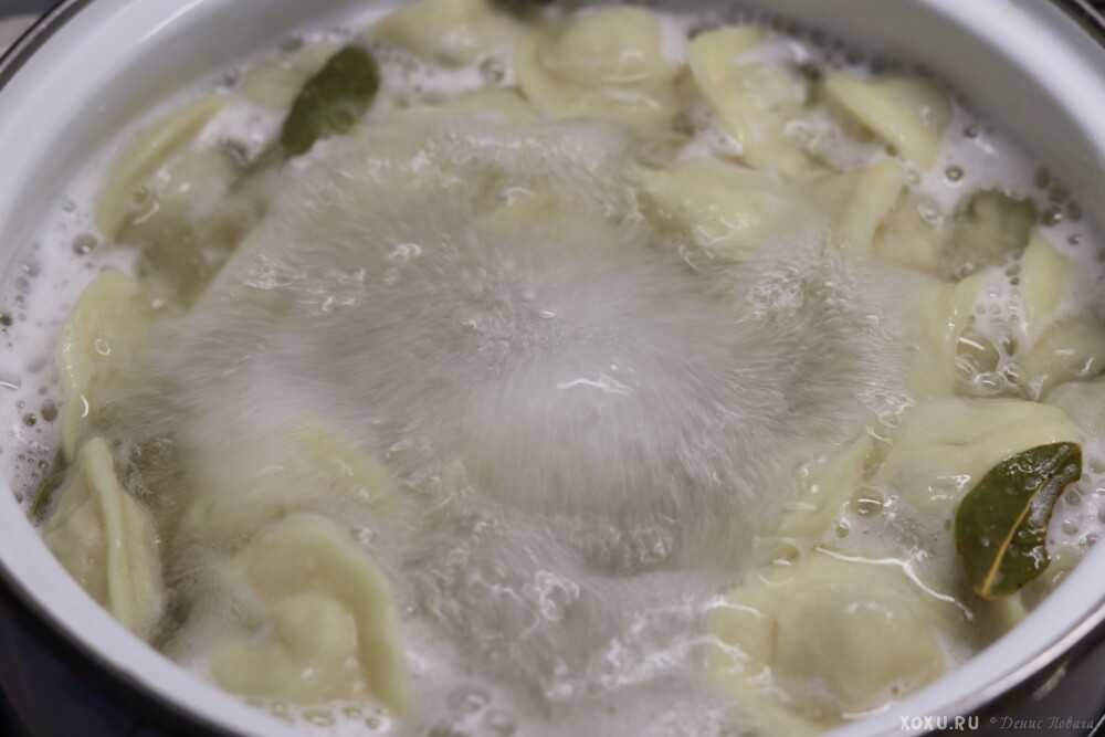 Готовые пельмешки будут немного менять форму, скукоживаясь и всплывать на верх. Это говорит о том, что они готовы. В любом случае, спустя 5 минут – рекомендую достать одну пельмешку и попробовать на вкус. Разрежьте её пополам, чтобы проверить готовность теста в первую очередь в самых толстых местах. Фарш явно уже будет готов. Здесь главное, чтобы тесто не переварилось и в тоже время, было готово.
