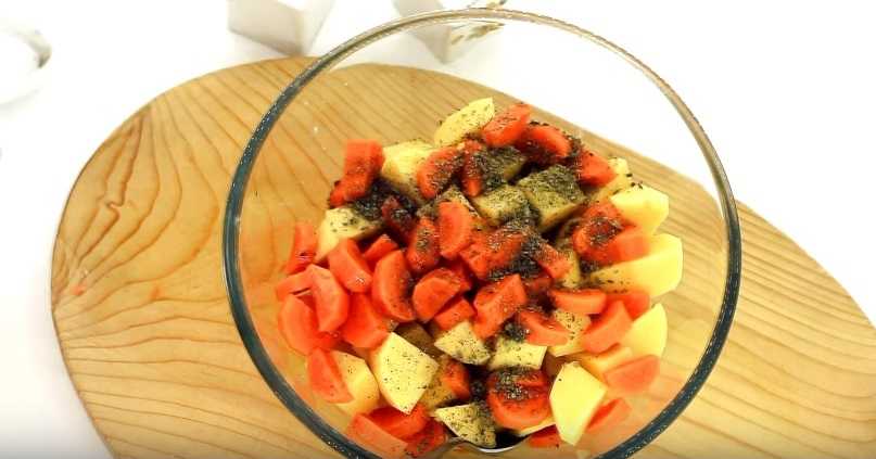 Смесь овощей посолите, поперчите, добавьте в ним сушеный майоран. Он отлично подходит к картошке. Влейте растительное масло и помешайте.