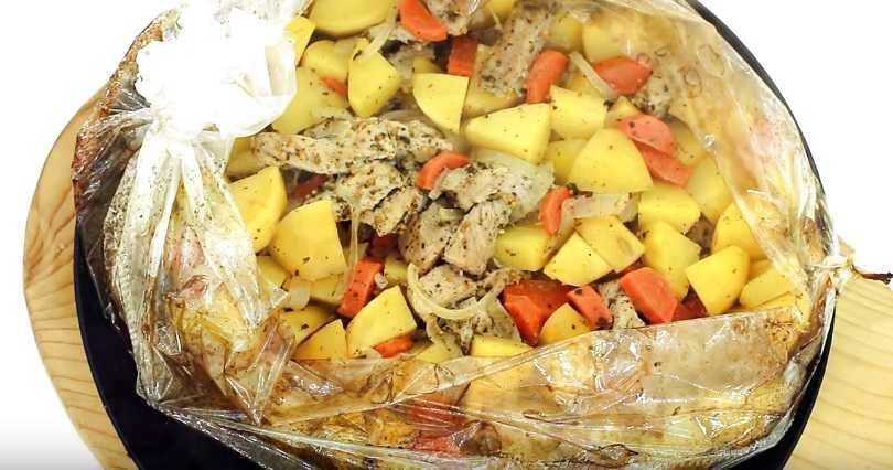 Соедините замариновавшееся мясо и овощную смесь. Хорошенько перемешайте между собой. Возьмите рукав для запекания, закрепите одно сторону и положите в форму. Аккуратно переложите в него подготовленную смесь мясо-картофельную смесь.
