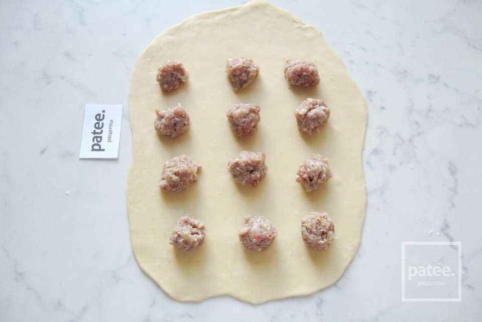 Выложить фарш рядами на пласт теста. Приблизительно по 0,5 чайной ложки.