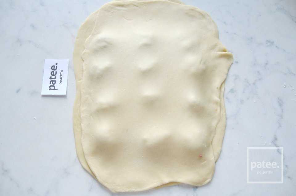 Раскатать также тонко второй пласт и накрыть им первый пласт теста с фаршем.