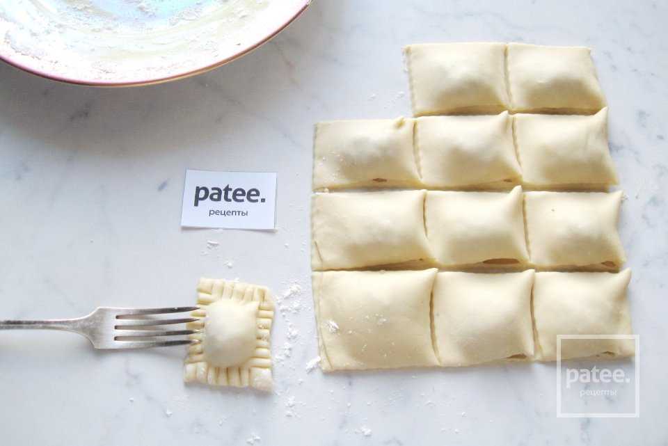 Тесто раскатать тонкими длинными пластами. На один, через равные промежутки, выложить по 1ч.л. начинки. Прикрыть вторым пустым пластом. Придавить и нарезать ровными квадратными.