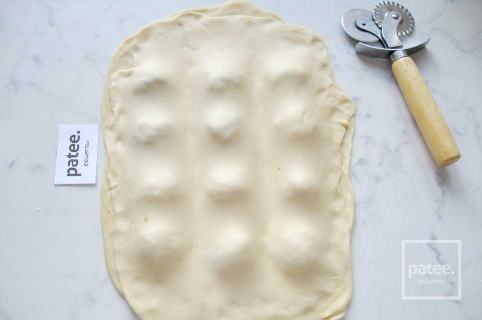 Затем сверху укладывается другой пласт, промежутки между будущими изделиями смазываются яичным белком или простой водой и слегка прижимаются, чтобы наметить места разрезов.