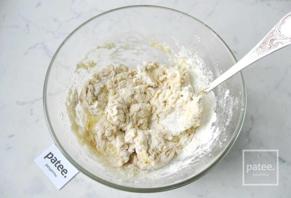 После выложить тесто на стол, присыпанный мукой и замесить крутое, эластичное тесто. На замес уйдет минут 10-15. Поставить его в холодильник на 20-30 минут. Охлажденное тесто будет пластичным и более удобным в работе.