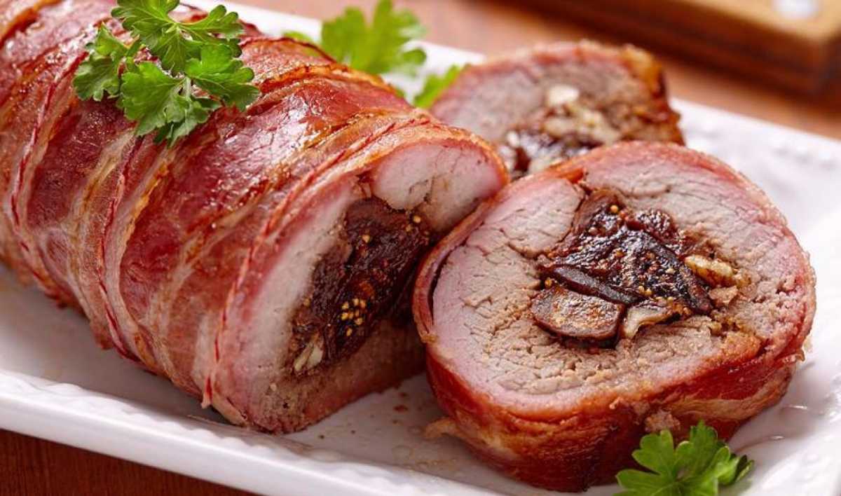 Необязательно запекать свинину цельным куском — для праздника будет уместнее подача в виде рулета. При этом начинка может быть любой, на усмотрение хозяйки. В данном случае он готовится с болгарским перцем, чесноком и черносливом.