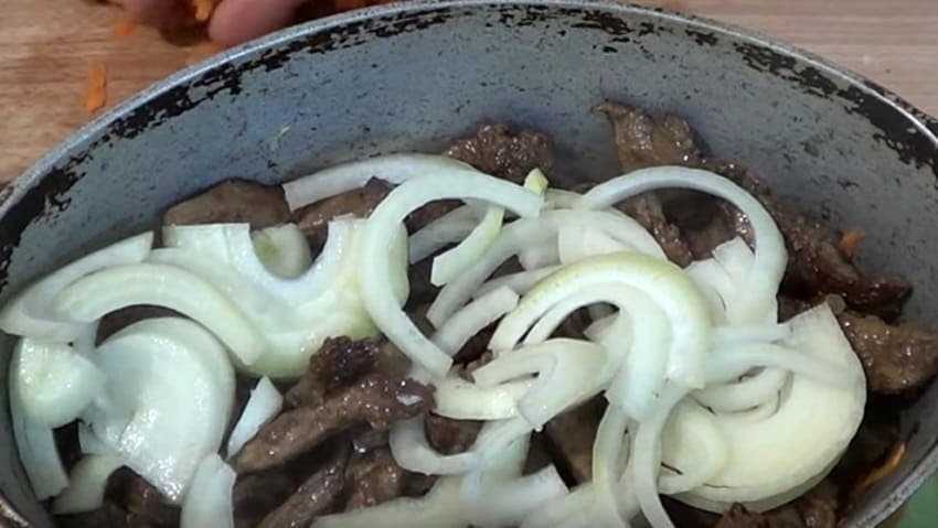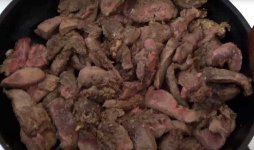 6. Не забываем помешивать жарящийся лук. А также выкладываем субпродукт на отдельную разогретую сковородку, политую растительным маслом. Поджариваем без специй, с двух сторон до румяной корочки на среднем огне.