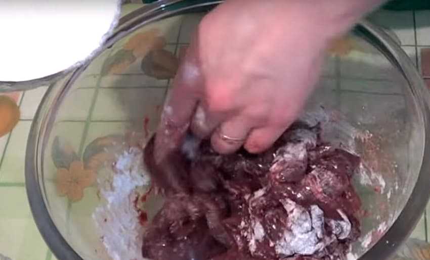 - Посыпать нарезанную свинину мукой и перемешать, чтобы она равномерно распределилась по кусочкам.