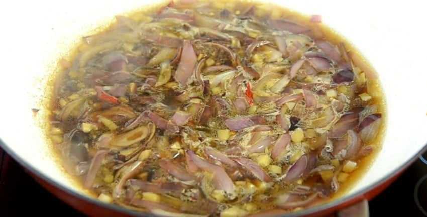 3. В отдельную сковороду влейте масло и выложите лук, чеснок, имбирь и чили. Перемешайте и обжаривайте овощи на среднем огне, пока они не впитают масло и не станут мягкими.