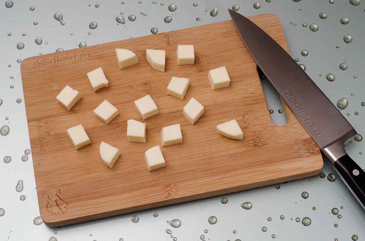 3. Моцареллу нарезать кубиками со стороной примерно 1.5 см. Мне больше нравится использовать твердую моцареллу «для пиццы», поскольку она хорошо плавится и получается аппетитно тягучей. Но не возбраняется взять свежую рассольную моцареллу, тем более что она иногда продается в виде маленьких шариков, которые так и просятся в серединку рисовых аранчини.