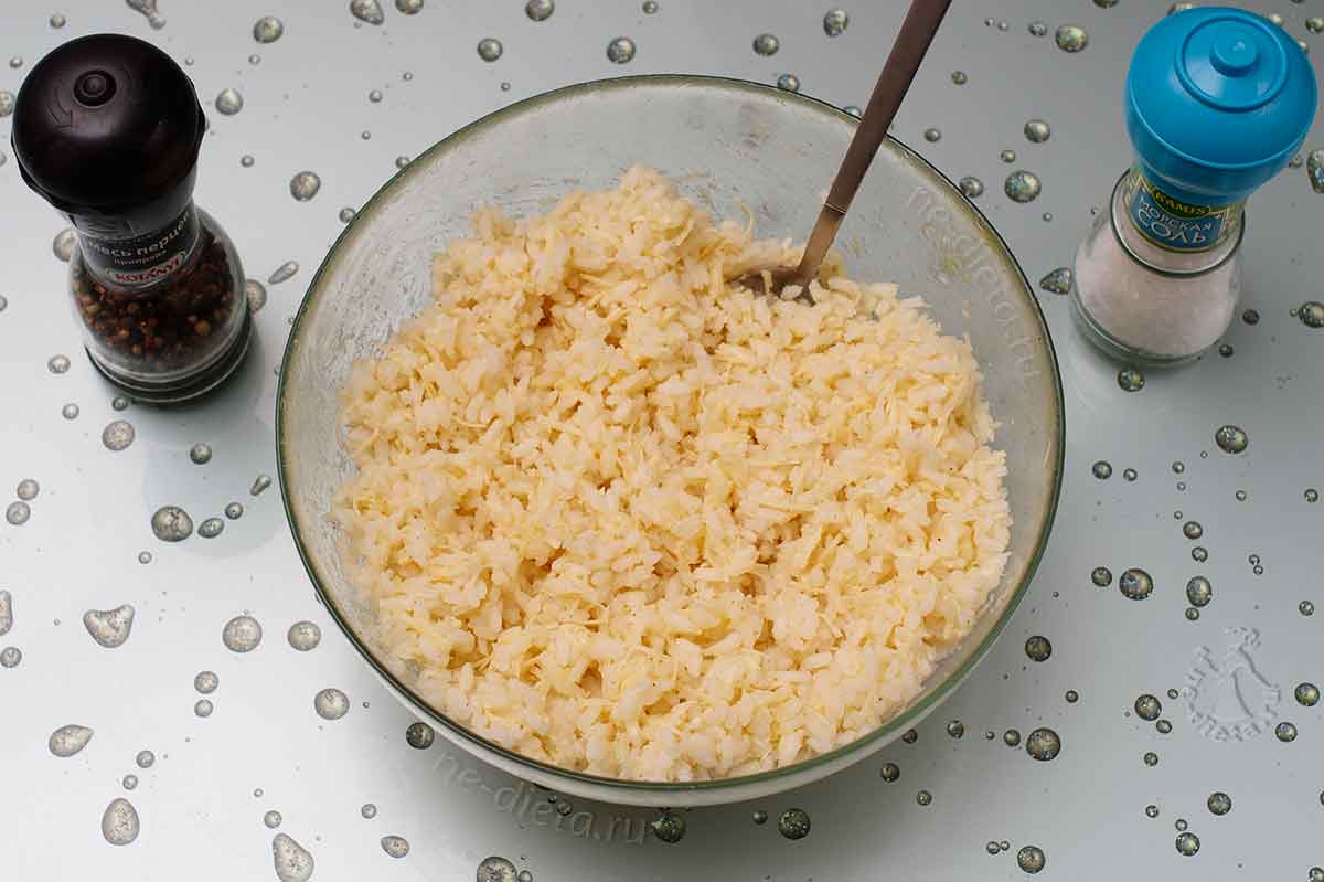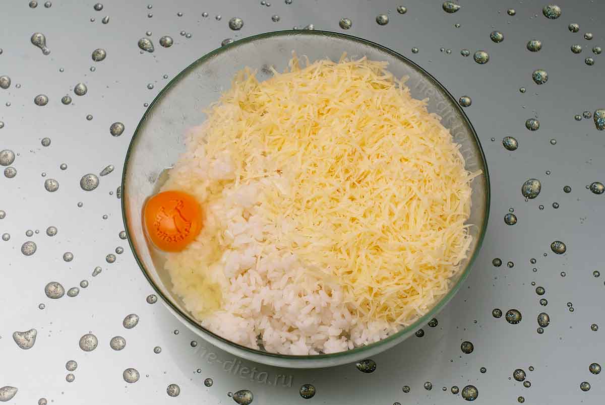 - К рису добавляют 4 яйца и натертый на мелкой терке твердый сыр. Замешивают все компоненты в однородную массу. Добавляют на свой вкус соль и перец.